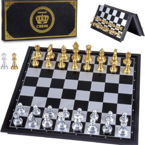 10” Magetic Travel Chess Set, Plastic Portable Folding Chess Board Game with Gold and Silver Chess Pieces – 2 Extra Queens – Chess for Beginner, Kids, Adults