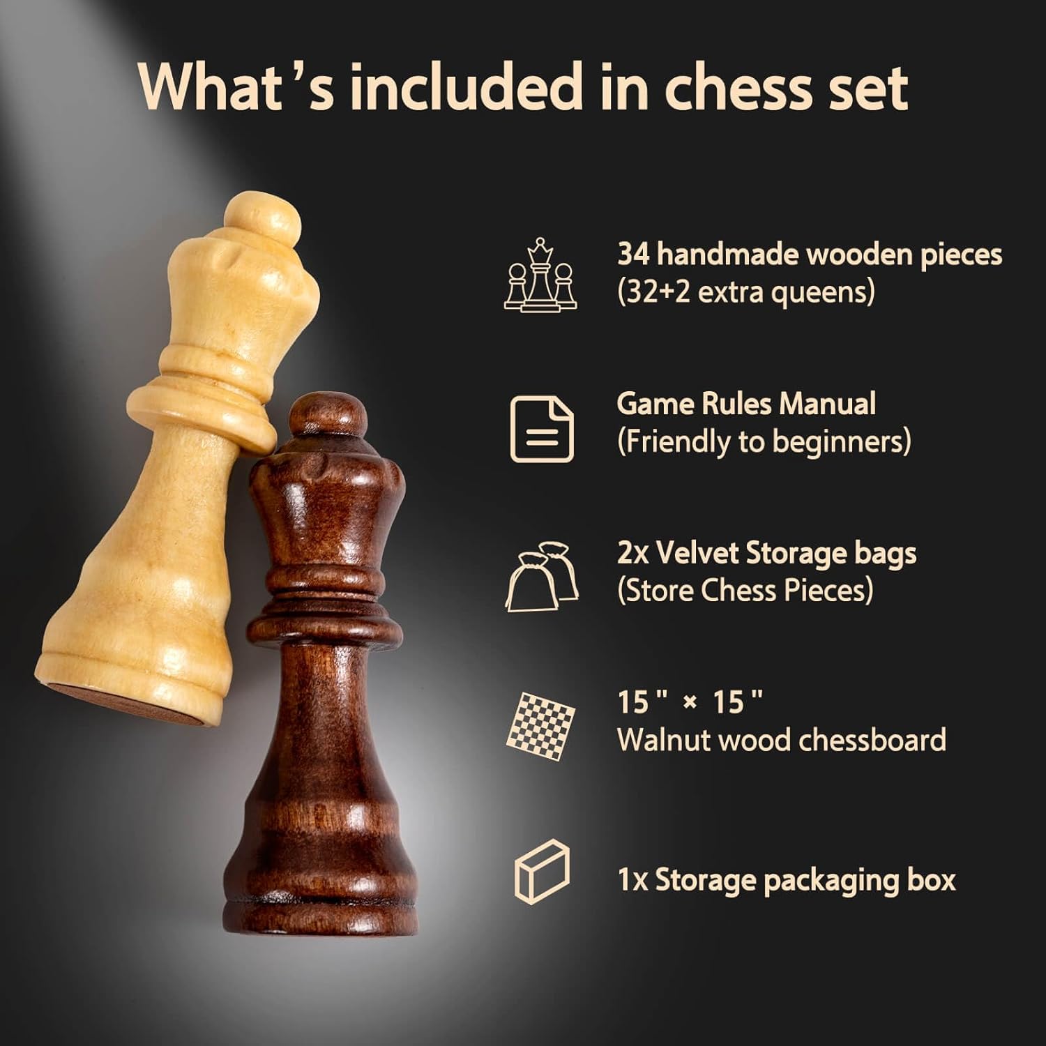 Chess Set Board Games for Adults: Handmade Walnut Wooden 15″ 2 Extra Queens Folding Portable Travel Gift idea Pieces Storage Bags Instructions