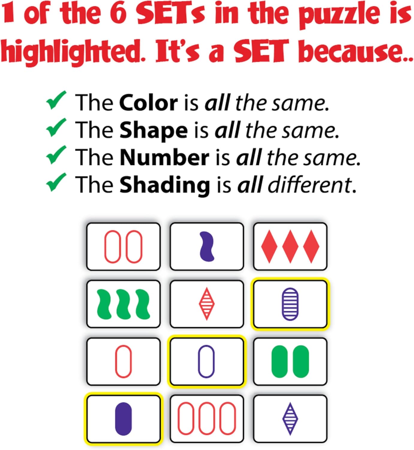 - FUN GAME PLAY—Race to find as many SETs as you can (each individual feature is all the same or all different)